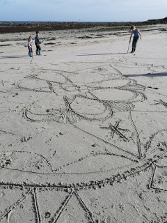 Des visages puis des bustes sont sortis du sable et même des êtres allongés mi-humain, mi-poisson. Enfin, les jeunes ont décidé de « planter » un arbre avec une grosse branche échouée. Orné d’algues et d’un collier de coquillage c’est devenu un majestueux totem.