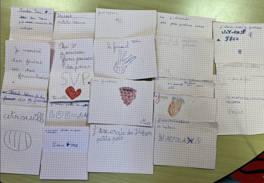 En début de matinée, l’institutrice des CE1 CE2 est venue nous remettre une enveloppe contenant une lettre et un mot de chaque élève concernant le potager.