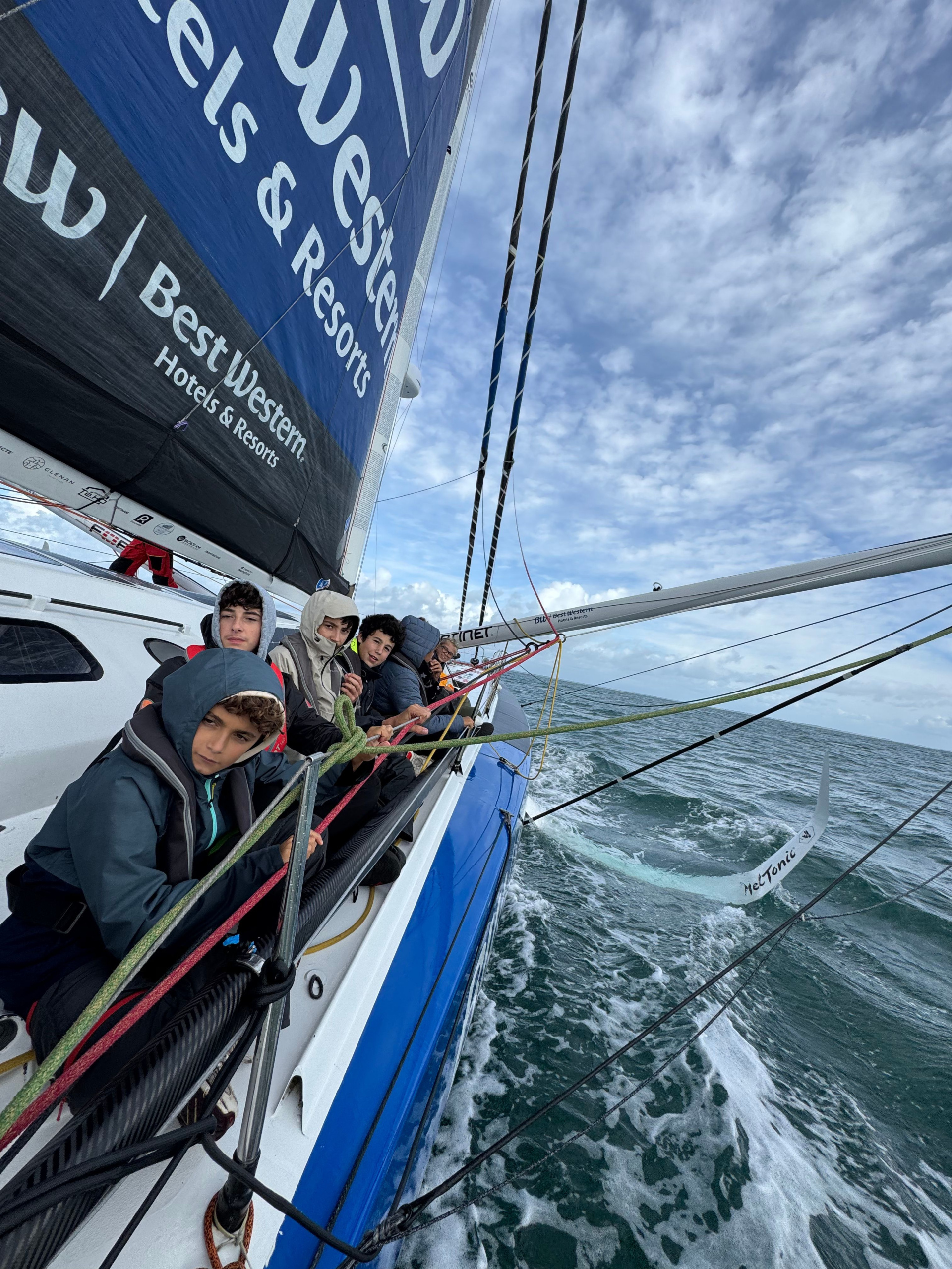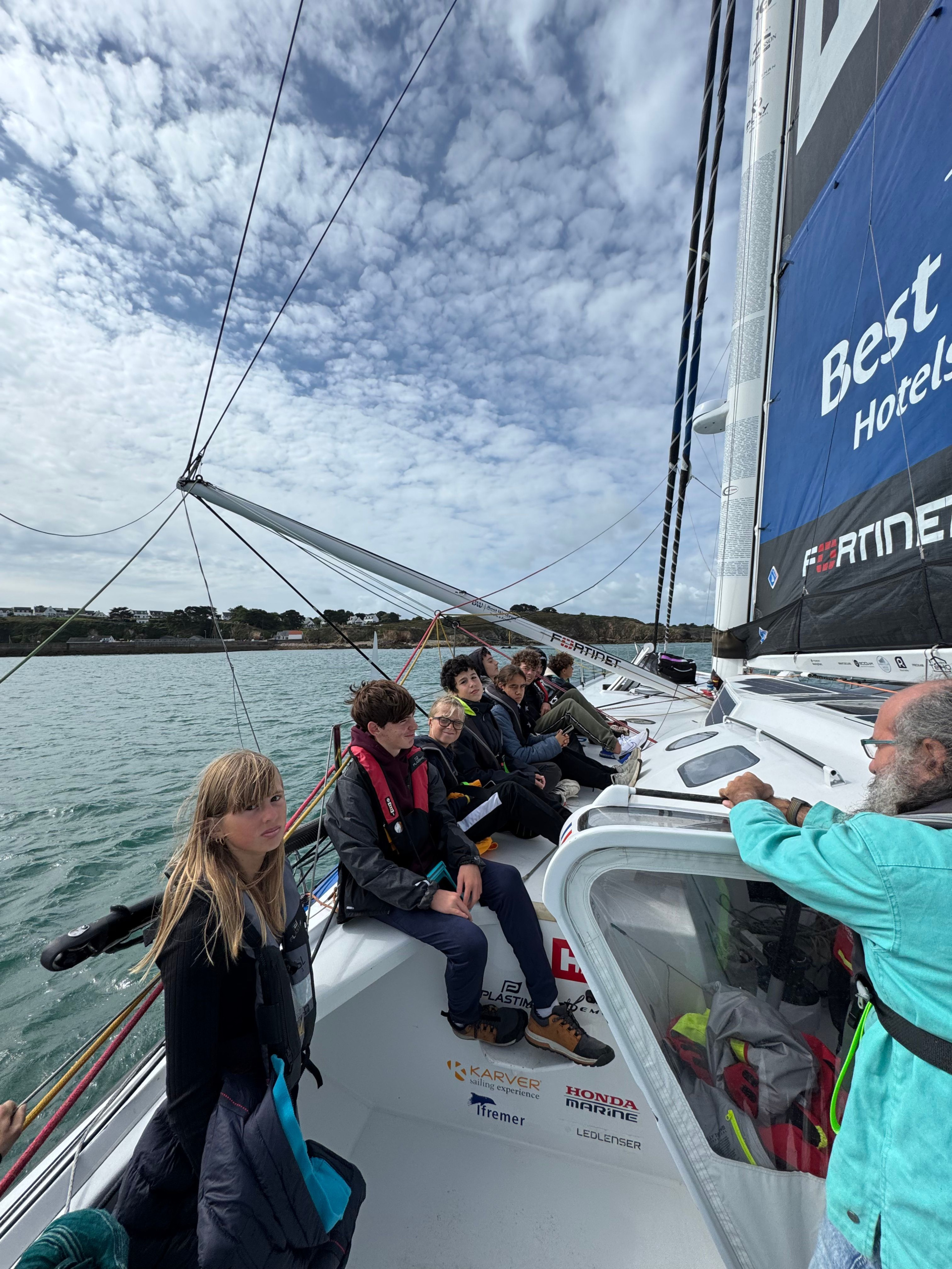 Le vendredi 12 septembre à 12h30, nous sommes descendus au port de Houat pour prendre un zodiac qui nous a menés sur le bateau de Romain Attanasio, skipper du Vendée Globe 2025. Nous nous sommes installés à l’avant du bateau. Après ils ont utilisé un petit moteur pour s’éloigner du port, ensuite, ils ont hissé le foc. Nous avons commencé à prendre de la vitesse jusqu’à aller jusqu’à 29 nœuds ! Le bateau penchait et ça mouillait. Puis au Phare de la Teignouse, le bateau à viré de bord pour rentrer au port, et on a dû changer de côté. Quand nous sommes arrivés nous avons remercié Romain Attanasio et ses équipiers pour cette traversée impressionnante et inoubliable. « C’était magique ! », « c’était comme à la fête foraine ! ».